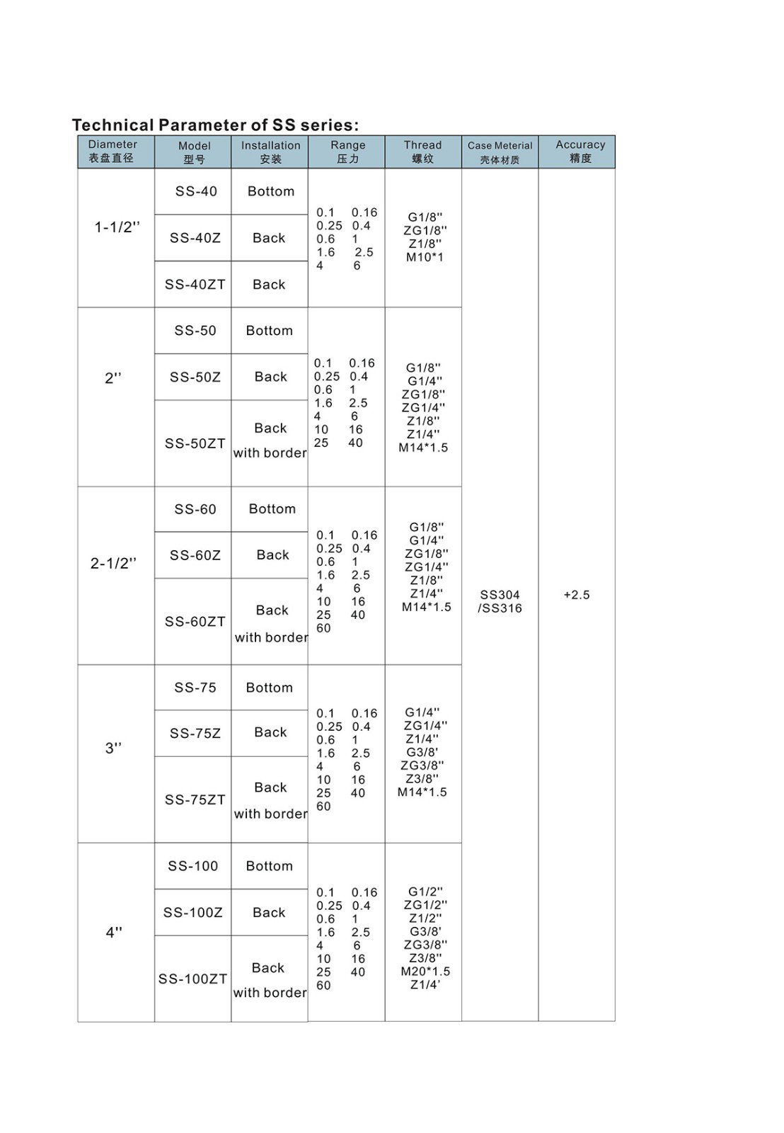 SS系列全不锈钢压力表
